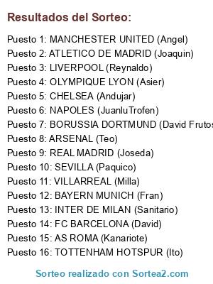 Lista de participantes: FC BARCELONA (David), REAL MADRID (Joseda), BORUSSIA DORTMUND (David Frutos), MANCHESTER UNITED (Angel), CHELSEA (Andujar), ARSENAL (Teo), OLYMPIQUE LYON (Asier), ATLETICO DE MADRID (Joaquin), SEVILLA (Paquico), NAPOLES (JuanluTrofen), AS ROMA (Kanariote), LIVERPOOL (Reynaldo), INTER DE MILAN (Sanitario), TOTTENHAM HOTSPUR (Ito), BAYERN MUNICH (Fran), VILLARREAL (Milla).