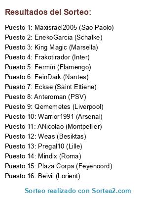 Lista de participantes: Beivii (Lorient), Pregal10 (Lille), Frakotirador (Inter), EnekoGarcia (Schalke), Weas (Besiktas), ANicolao (Montpellier), Plaza Corpa (Feyenoord), Anteroman (PSV), Warrior1991 (Arsenal), Fermín (Flamengo), FeinDark (Nantes), King Magic (Marsella), Mindix (Roma), Qememetes (Liverpool), Maxisrael2005 (Sao Paolo), Eckae (Saint Ettiene).
