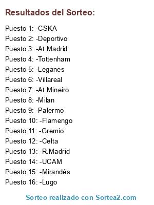 Lista de participantes: -UCAM, -Gremio, -Milan, -R.Madrid, -Tottenham, -At.Madrid, -Leganes, -Lugo, -Celta, -At.Mineiro, -Palermo, -Flamengo, -Mirandés, -Deportivo, -CSKA, -Villareal.