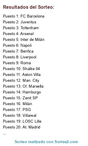 Lista de participantes: Real Madrid, Barcelona, Inter, Milán, Man. City, Arsenal, Villareal, Chelsea, B. Leverkusen, Napoli, Roma, PSG, Liverpool, Ol. Lyon, Werder Bremen, Hamburgo, Tottenham, Aston Villa, Ol. Marsella, Oporto, Zenit SP, LOSC Lille, Benfica, Valencia, Man. United, At. Madrid, B. Munich, Sevilla, CSKA, Shalke 4, Borussia Dortmund, Juventus.