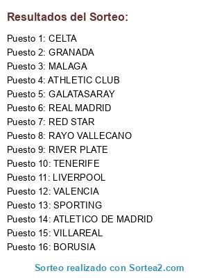 Lista de participantes: SPORTING, CELTA, BORUSIA, REAL MADRID, ATLETICO DE MADRID, TENERIFE, ATHLETIC CLUB, VILLAREAL, VALENCIA, RED STAR, GRANADA, RIVER PLATE, MALAGA, LIVERPOOL, RAYO VALLECANO, GALATASARAY.