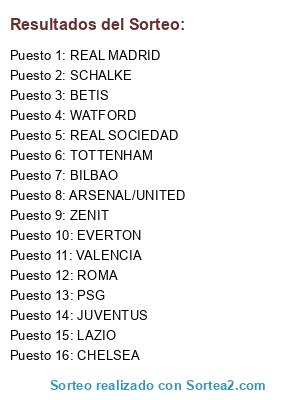 Lista de participantes: REAL MADRID, WATFORD, VALENCIA, BETIS, ZENIT, CHELSEA, SCHALKE, LAZIO, ARSENAL/UNITED, REAL SOCIEDAD, TOTTENHAM, ROMA, PSG, EVERTON, JUVENTUS, BILBAO.