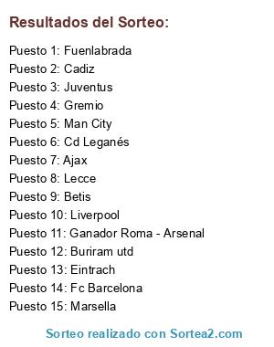 Lista de participantes: Fc Barcelona, Cd Leganés, Marsella, Juventus, Eintrach, Fuenlabrada, Lecce, Man City, Ganador Roma - Arsenal, Betis, Ajax, Buriram utd, Ínter milan, Cadiz, Gremio, Liverpool.