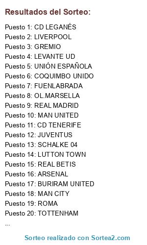 Lista de participantes: LEVANTE UD, SCHALKE 04, REAL MADRID, AJAX AMSTERDAM, OL.MARSELLA, FC BARCELONA, MAN UNITED, CD TENERIFE, REAL BETIS, GREMIO, FUENLABRADA, LUTTON TOWN, RIVER PLATE, LIVERPOOL, COQUIMBO UNIDO, MAN CITY, JUVENTUS, UNIÓN ESPAÑOLA, TOTTENHAM, CD LEGANÉS, ROMA, ARSENAL, BURIRAM UNITED, ÍNTER MILAN.