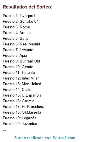 Lista de participantes: Schalke 04, Ajax, Real Madrid, Fc Barcelona, Tenerife, Cadiz, Buriram Utd, Liverpool, Man United, Gremio, Leganés, Betis, Ol.Marsella, Levante, Fuenlabrada, Ínter Milan, Eintrach Frankfurt, Roma, Man City, Getafe, Lecce, Juventus, U.Española, Arsenal.