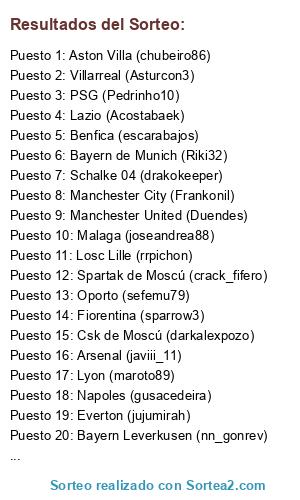 Lista de participantes: Santos (peruanoforce2), Schalke 04 (drakokeeper), Lyon (maroto89), Valencia (Dantejj17), Lazio (Acostabaek), Malaga (joseandrea88), Marsella (UnaBorde), Aston Villa (chubeiro86), Manchester City (Frankonil), Fiorentina (sparrow3), Liverpool (lenguasco), Chelsea (kasi_____sei ), Bayern de Munich (Riki32), Spartak de Moscú (crack_fifero), Csk de Moscú (darkalexpozo), A.C.Milan (jose_medi), Tottenham (Dakini91), Zenit (xabel85), Losc Lille (rrpichon), Villarreal (Asturcon3), Benfica (escarabajos), Manchester United (Duendes), Roma (Huevon27), At.Bilbao(OILSTENEER), Arsenal (javiii_11), PSG (Pedrinho10), Anzhi (Arkhan99), Juventus (rubenmartin10), Napoles (gusacedeira), Oporto (sefemu79), Everton (jujumirah), Bayern Leverkusen (nn_gonrev).