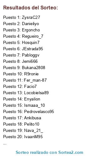 Lista de participantes: Danieliyo, Assasinstoto, IvaanM95, Over1990, JEstrada95, Juangutierrez91, Pabloggv, Isma123i, Ramalho55, Nava_21_, Gysan_CLS, R9ronie, Hosquin7, Furru_asesino21, J_murcia, Pelito10, Locobielsa89, Bukana2808, Pelizelli, Ankibusa, Ergoncho, Regueiro_7, Ismaaa_10, Jemi666, Facio7, Pedrovelasco95, Enyalion, ZysraC27, Aronsito89, Fer_man-87, Abraham_2210, Arovira9.