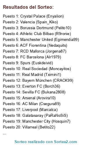 Lista de participantes: Valencia (Spain_Kiko), Athletic Club Bilbao (R9ronie), Liverpool (Marcalca), Elche (isma123i), Spurs (Euskdeivid), Juventus (Adrimaister10), Manchester City (Hosquin7), Everton FC (Borch36), AS Roma (Juangutierrez91), Sevilla FC (Bukana2808), Galatasaray (PaRaNoSiS), Fenerbahçe SK (Braveitor97), Porto (txinoathletic58), Crystal Palace (Enyalion), Real Sociedad (Moncayitos), Arsenal (Arovira10), Deportivo de La Coruña (Pabloggv), Villarreal (Betito22), Borussia Dortmund (Pelito10), Bayern München (CRACK99), Schalke 04 (Gysan_CLS), AC Milan (Csegura89), Atlético de Madrid (Marjaivan), Queens Park Rangers (Sacisto), Napoli (Facio7), ACF Fiorentina (Nedaquits), Inter de Milan (El_mercu), FC Barcelona (Alr1979), RCD Mallorca (Jorgena87), Zenit San Petersburgo (Kano31121993), Real Madrid (Tximini1), Manchester United (Egimendia99).