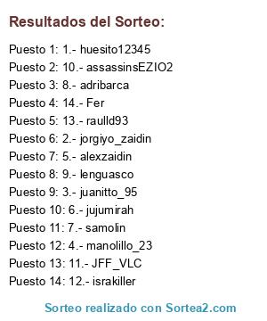 Lista de participantes: 1.- huesito12345, 2.- jorgiyo_zaidin, 3.- juanitto_95, 4.- manolillo_23, 5.- alexzaidin, 6.- jujumirah, 7.- samolin, 8.- adribarca, 9.- lenguasco, 10.- assassinsEZIO2, 11.- JFF_VLC, 12.- israkiller, 13.- raulld93, 14.- Fer.