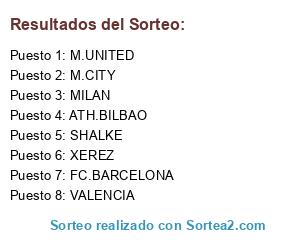 Lista de participantes: XEREZ, M.UNITED, M.CITY, FC.BARCELONA, SHALKE, VALENCIA, MILAN, ATH.BILBAO.