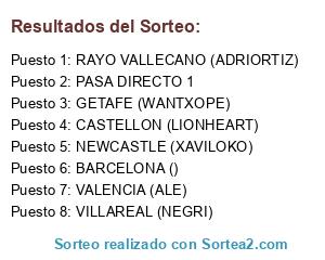 Lista de participantes: VALENCIA (ALE), NEWCASTLE (XAVILOKO), VILLAREAL (NEGRI), BARCELONA (), RAYO VALLECANO (ADRIORTIZ), PASA DIRECTO 1, GETAFE (WANTXOPE), CASTELLON (LIONHEART).