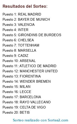 Lista de participantes: GIRONDINS DE BURDEOS, BARCELONA, VALENCIA, CELTA DE VIGO, BAYER DE MUNICH, MILAN, CADIZ, CHELSEA, MARSELLA, RAYO VALLECANO, INTER, LECCE, WENDER BREMEN, ARSENAL, FIORENTINA, BETIS, TOTTENHAM, ATLETICO DE MADRID, REAL MADRID, MANCHESTER UNITED.