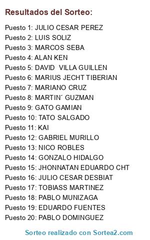 Lista de participantes: LUIS SOLIZ, TOBIASS MARTINEZ, NICO ROBLES, TATO SALGADO, MARIANO CRUZ, MARIUS JECHT TIBERIAN, MARTIN´ GUZMAN, ALAN KEN, MARCOS SEBA, EDUARDO FUENTES, GATO GAMIAN, GONZALO HIDALGO, GABRIEL MURILLO, JULIO CESAR DESBIAT, DAVID VILLA GUILLEN, JULIO CESAR PEREZ, JHONNATAN EDUARDO CHT, PABLO DOMINGUEZ, PABLO MUNIZAGA, KAI.