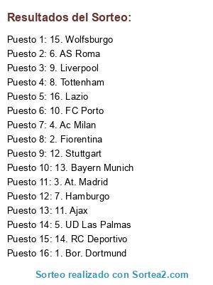 Lista de participantes: 1. Bor. Dortmund, 2. Fiorentina, 3. At. Madrid, 4. Ac Milan, 5. UD Las Palmas, 6. AS Roma, 7. Hamburgo, 8. Tottenham, 9. Liverpool, 10. FC Porto, 11. Ajax, 12. Stuttgart, 13. Bayern Munich, 14. RC Deportivo, 15. Wolfsburgo, 16. Lazio.