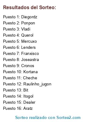 Lista de participantes: Franxisco, Dealer, Mercuxo, Cheche, Diegordz, Ponpon, Bit, Lenders, Kortana, Querol, Vladi, Cronos, Raulinho_jugon, Aratz, Joseastra, Itogol.