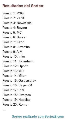 Lista de participantes: MU, MC, Chelsea, Juve, R.M, Barsa, Milan, Borussia, Newcatsle, Inter, Liverpool, Bayern, Bayern04, Zenit, Napoles, Galatasaray, PSG, Roma, A.M, Oporto, Tottenham, Lazio, Valencia, Juventus.