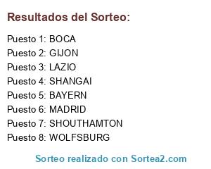 Lista de participantes: WOLFSBURG, MADRID, GIJON, LAZIO, BOCA, BAYERN, SHANGAI, SHOUTHAMTON.