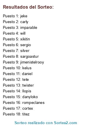 Lista de participantes: silver, tete, kelus, jeke, llopis, cortex, danyloko, titez, sergio, jimenistelrooy, rompeclanes, imparable, sargoastur, twister, carly, xikitin, will, daniel.