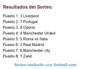 Lista de participantes: 1 Zenit, 2 Real Madrid, 3 Liverpool, 4 Manchester United, 5 Roma vs Italia, 6 Manchester city, 7 Portugal, 8 Oporto.
