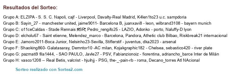 Lista de participantes: Shaoking860- Galatasaray, Kojakgraphic182 - Chelsea, pazmati9 fila1444, - SAO PAULO, Davalty-Real Madrid, jaime9011- Barcelona B, Riskbreak21 internacional, Sayin_27 - manchester united, Fabianzionoiz - fiorentina, valcrist - hjuihjj - PSG, Stiflerstif - juventus, o11ceCaldas - Stade Rennais #SR, Demntor10 -AC milan, the-_-pain-rb - roma, Melendez_marco - Barcelona, Adonko - porto, vasco1208 -- Real Betis, juanxavi8 - leon, wilbrand3108 - bayern munich, Javle27 - PSV, Jamoro2011-Boca Junior, Naluffy-D lyon, Nelsinho23-Sevilla, ELZIPA - S. S. C. Napoli, K4len1to23 u.c. sampdoria, cajf - Liverpool, dka2023 - arsenal, adriancho_barce Inter de Milán, Pandora, Athetic club Bilbao, Pedro_rengifo25 - LAZIO, Decano_torres Atl NAcional, elcholu67 - Saint etienne, sebastico420 - river plate.