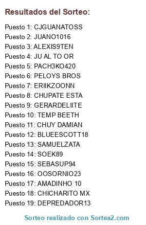 Lista de participantes: AMADINHO 10, OOSORNIO23, CHUPATE ESTA, TEMP BEETH, JUANO1016, CJGUANATOSS, CHUY DAMIAN, CHICHARITO MX, BLUEESCOTT18, DEPREDADOR13, ALEXIS9TEN, PELOYS BROS, SEBASUP94, SAMUELZATA, PACH3KO420, JU AL TO OR, SOEK89, ERIIKZOONN, GERARDELIITE.
