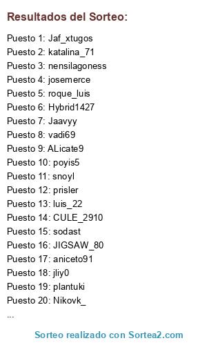 Lista de participantes: aniceto91, Jaf_xtugos, luis_22, roque_luis, prisler, ALicate9, katalina_71, snoyl, Hybrid1427, fransev, nensilagoness, vadi69, josemerce, RiXi_21, david77, Jaavyy, CULE_2910, Nikovk_, jliy0, JIGSAW_80, pespon, plantuki, poyis5, sodast.