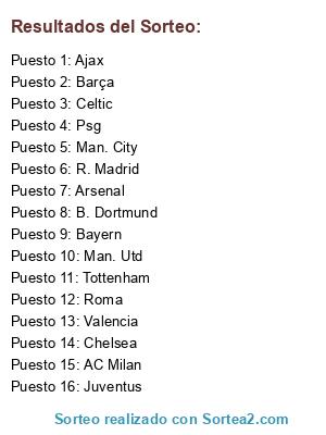 Lista de participantes: AC Milan, Roma, Juventus, Ajax, B. Dortmund, Barça, R. Madrid, Arsenal, Chelsea, Valencia, Man. Utd, Man. City, Bayern, Celtic, Psg, Tottenham.