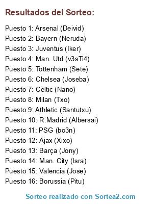 Lista de participantes: Ajax (Xixo), Arsenal (Deivid), Athletic (Santutxu), Barça (Jony), Bayern (Neruda), Borussia (Pitu), Celtic (Nano), Chelsea (Joseba), Juventus (Iker), Man. City (Isra), Man. Utd (v3sTi4), Milan (Txo), PSG (bo3n), R.Madrid (Albersai), Tottenham (Sete), Valencia (Jose).