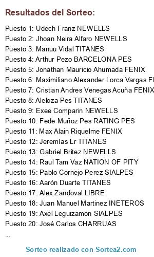 Lista de participantes: Max Alain Riquelme FENIX, Arthur Pezo BARCELONA PES, Gustavo Garcete TITANES, Exee Comparin NEWELLS, Alex Zandoval LIBRE, Esteban Pes TITANES, Raul Tam Vaz NATION OF PITY, Jose Saez FENIX, Puchi Fenandez TITANES, Tobias Arenz LBRE, Gabriel Britez NEWELLS, Rodrigo Alejandro Robledo Godoy FENIX, Rodrigo Aracena FENIX, Maximiliano Alexander Lorca Vargas FENIX, Jair Matos Caycho NEWELLS, Aarón Duarte TITANES, Cristian Andres Venegas Acuña FENIX, José Carlos CHARRUAS, Pool Bsc Uio BARCELONA PES, Jhoan Neira Alfaro NEWELLS, Manuu Vidal TITANES, Jeremías Lr TITANES, Robert Alvarado Echegaray NEWELLS, Aleloza Pes TITANES, Francisco Reyes Vilches INETEROS, Axel Leguizamon SIALPES, Udech Franz NEWELLS, Juan Manuel Martinez INETEROS, Pablo Cornejo Perez SIALPES, Marcus Martinez TITANES, Fede Muñoz Pes RATING PES, Jonathan Mauricio Ahumada FENIX.