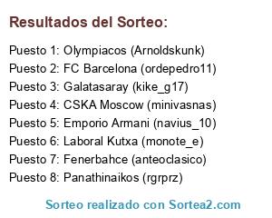 Lista de participantes: Olympiacos (Arnoldskunk), Panathinaikos (rgrprz), CSKA Moscow (minivasnas), Galatasaray (kike_g17), Laboral Kutxa (monote_e), Fenerbahce (anteoclasico), FC Barcelona (ordepedro11), Emporio Armani (navius_10).