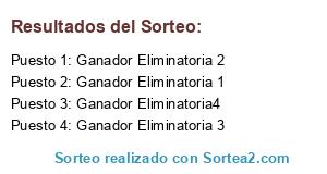 Lista de participantes: Ganador Eliminatoria 1, Ganador Eliminatoria 2, Ganador Eliminatoria 3, Ganador Eliminatoria4.