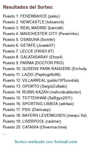 Lista de participantes: REAL MADRID (baricelli), FC BARCELONA (WILLY18 T9R10), AT.MADRID (rastamanlasarte), VILLARREAL (pablo1975cordob), MALAGA (TurfyTomas), SEVILLA (x SES x), ESPANYOL (PULIFUMI), ATHLETIC BILBAO (slassi14), REAL SOCIEDAD (thecatonair), VALENCIA (fitohipi), GETAFE (Josele07), GRANADA (Antycules), OSASUNA (Sorinkt), ARSENAL (Naranjito82), MANCHESTER CITY (Pereirinho), MANCHESTER UNITED (Principito85), CHELSEA (poyove), TOTTENHAM (SeRgyo2011), ASTON VILLA (pablotp), LIVERPOOL (raulmar), EVERTON (diego gallego), BOLTON (deviantpurse60), STOKE CITY (OverPick), QUEENS PARK RANGERS (Erchuliyo 24), NEWCASTLE (totxarock), MILAN (kikofer), INTER (Jayoldi), JUVENTUS (lobitooooo), NAPOLES (Murill069), ROMA (manolozon), FIORENTINA (exposito11), LAZIO (Pepitogrillo96), UDINESE (izenbako123), PARMA (DOCTOR PRO), PALERMO (aitorr92), GENOA (jon noci irun), LECCE (FANDI 87), CATANIA (Olivermachine), BAYERN MUNICH (colon666), PSG (Danivasp), OPORTO (SergioCollado), MARSELLA (poliny), LYON (guss km), LILLE (DAVILON69), FENERBAHCE (pakiu), BENFICA (DanieloAmador85), GALATASARAY (Ehos4), BAYERN LEVERKUSEN (menpu Xd), PSV (Namukai360), RUBIN KAZAN (mefundoaldoctor), SPORTING LISBOA (adrikaii).