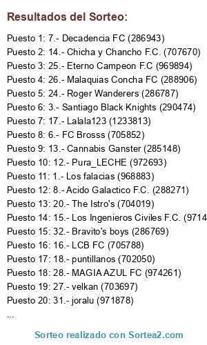 Lista de participantes: Los falacias (968883), Los Kato UC (1234464), Santiago Black Knights (290474), C.D.A O'Higgins de rgua (971543), Albo Eterno F.C. (271692), FC Brosss (705852), Decadencia FC (286943), Acido Galactico F.C. (288271), Uno + Ocho FC (972400), DUT FC (975828), Rockeros FC. (706753), Pura_LECHE (972693), Cannabis Ganster (285148), Chicha y Chancho F.C. (707670), Los Ingenieros Civiles F.C. (971432), LCB FC (705788), Lalala123 (1233813), puntillanos (702050), Tropa De'Elite (1237904), The Istro's (704019), Este equipo no tiene nombre F. C. (703995), Dark Southem (283096), Fast Splash (290228), Roger Wanderers (286787), Eterno Campeon F.C (969894), Malaquias Concha FC (288906), velkan (703697), MAGIA AZUL FC (974261), Centro Unido (973179), ROSTOCK (975630), joralu (971878), Bravito's boys (286769).