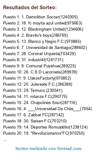 Lista de participantes: 1. Demolition Soccer(1240305), 2. Bravito's boys(286769), 3. Harrizones(285749), 4. ___Universidad De Chile___(705422), 5. Picapiedras(702912), 6. Zabbat FC(287142), 7. Universidad de Santiago(288602), 8. Comunal Puyehue(289225), 9. LlakoxFactorty(970852), 10. Real Porotito FC(285891), 11. mtanza F.C(290775), 12. Blackingham United(1234606), 13. Blanco y Negro F.C:(970885), 14. Deportes Romualdito(1238124), 15. MiniTeam!(287687), 16. real indech(702329), 17. Akatsukis!~(1241059), 18. fc moyita azul united(975663), 19. *Revolucionarios*FC(970250), 20. Julereate F.C.(286388), 21. Independiente de ñuñoa(288677), 22. TcO_ThEbEsT(705669), 23. Piquete Jurídico(294059), 24. Chapulines Sour(287116), 25. !!!Miau!!!(286867), 26. C.S.D Lacorneta(289939), 27. Poseidon DC(707474), 28. Coronel Urquieta(703429), 29. Temuco.(230541), 30. Seisen F.C(703210), 31. industri4l(1241731), 32. GoolStyle(1234019).