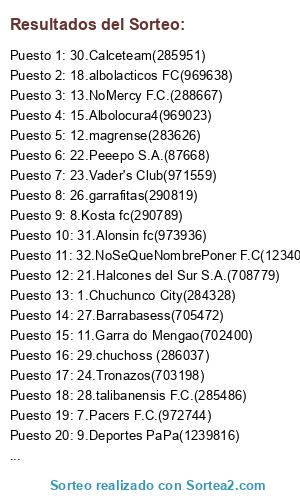 Lista de participantes: 1.Chuchunco City(284328), 2.!!!Miau!!!(286867), 3.the xorizos(282945), 4.Club de Deportes Cobreloa S.A.(708447), 5.kanakas(271744), 6.Athletico Bonvallet(289727), 7.Pacers F.C.(972744), 8.Kosta fc(290789), 9.Deportes PaPa(1239816), 10.U.de.Chile.(706308), 11.Garra do Mengao(702400), 12.magrense(283626), 13.NoMercy F.C.(288667), 14.Grande_albo(289048), 15.Albolocura4(969023), 16.los colorados(970696), 17.pincha-rata(1235219), 18.albolacticos FC(969638), 19.Koncepcion(969829), 20.tevimanes(974535), 21.Halcones del Sur S.A.(708779), 22.Peeepo S.A.(87668), 23.Vader's Club(971559), 24.Tronazos(703198), 25.Tecnos(283987), 26.garrafitas(290819), 27.Barrabasess(705472), 28.talibanensis F.C.(285486), 29.chuchoss (286037), 30.Calceteam(285951), 31.Alonsin fc(973936), 32.NoSeQueNombrePoner F.C(1234063).