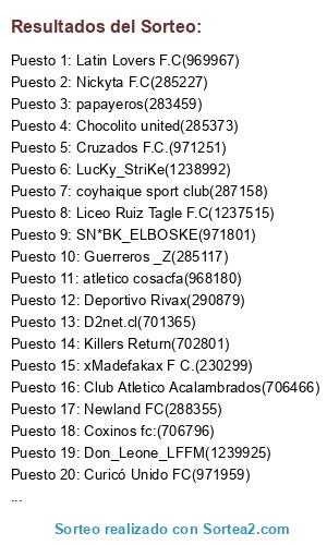 Lista de participantes: Guerreros _Z(285117), Cruzados F.C.(971251), Nickyta F.C(285227), papayeros(283459), SN*BK_ELBOSKE(971801), Deportes Lomas Coloradas(289564), xMadefakax F C.(230299), D2net.cl(701365), Abraxas(705511), coyhaique sport club(287158), >(704951), atletico cosacfa(968180), Los del Condo(287882), Newland FC(288355), Galgos F.C.(704759), Quiero Vale 4(1238796), Coxinos fc:(706796), Albolicos F.C(975177), Killers Return(702801), Flecha Roja(970084), Chocolito united(285373), Slackers F.C.(708431), Don_Leone_LFFM(1239925), Latin Lovers F.C(969967), La Torre FC(706568), Caña Brava F.C(701130), Club Atletico Acalambrados(706466), Deportivo Rivax(290879), LucKy_StriKe(1238992), Curicó Unido FC(971959), Penilane(702571), Liceo Ruiz Tagle F.C(1237515).