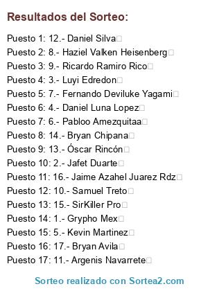 Lista de participantes: 1.- Grypho Mex, 2.- Jafet Duarte, 3.- Luyi Edredon, 4.- Daniel Luna Lopez, 5.- Kevin Martinez, 6.- Pabloo Amezquitaa, 7.- Fernando Deviluke Yagami, 8.- Haziel Valken Heisenberg, 9.- Ricardo Ramiro Rico, 10.- Samuel Treto, 11.- Argenis Navarrete, 12.- Daniel Silva, 13.- Óscar Rincón, 14.- Bryan Chipana, 15.- SirKiller Pro, 16.- Jaime Azahel Juarez Rdz, 17.- Bryan Avila.