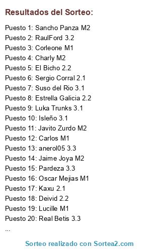 Lista de participantes: Emili Fenoll 3.1, Estrella Galicia 2.2, Miguelon M2, Sergio Corral 2.1, Jota 3.2, El Bicho 2.2, Jaime Joya M2, Francisco Carranco M1, Luka Trunks 3.1, Huracan 3.2, Ayabalo 3.3, Jose manuel flor 3.3, David Pachecho 2.1, Pedro M2, Raul Lopesino 2.1, Juan Carlos M1, Pardeza 3.3, Real Betis 3.3, Gol de casimiro 2.2, Zerrada 3.2, Jose Miguel Sanchez M2, Yban Figueroa 3.1, Rincon 3.4, Romero 2.2, Lucille M1, Manuel Gavilán 2.2, HT-78 2.1, Carlos M1, Suso del Rio 3.1, DABAMU 3.4, Javito Zurdo M2, Saul goodman 3.4, Joaquin FM, Isaam 2.2, Goatleti 2.1, Corleone M1, RaulFord 3.2, Jomicheque 3.2, Juanmi Caballero M1, KARRA9 3.3, CharlyZiZu M1, Sancho Panza M2, Alexpulga M1, Dami 3.2 58, Neefermaat 3.1, Isleño 3.1, anerol05 3.3, quirce24 3.2, Kaxu 2.1, Jota Ezponda M1, SergioMB 3.1, Danimador 3.3, Piru 3.1, Sevi M2, Deivid 2.2, Batigol 3.4, Oscar Mejias M1, Luca Toni 2.1, Aiub 2.1, Jose Maria 3.3, Charly M2, Dr.Edu/The gurú M2, Valladares 3.3, Perico17 2.1.