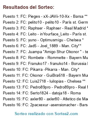Lista de participantes: FC: Pedro89pro - Pedro89pro - Real Madrid *, FC: Raphser - Raphser - Real Madrid **, FC: Okonor - GuiBra618 - Bayern Munich *, FC: Rombete - Rommette - Bayern Munich **, FC: yuno - Optimusmigu - Chelsea *, FC: Luis2718 - luilopias - Chelsea **, FC: 2pacxexur -asensionacher - Barsa*, FC: Pieges - xX-JAVii-10-Xx - Barsa **, FC: Pikarra -Pikarra - Man. City*, FC: Jad5 - Joel_1889 - Man. City**, FC: Leito - inYourface_Leito - París st. Germáin*, FC: pelito10 - pelito10 - París st. Germáin **, FC: axler80 - axler80 - Atletico de Madrid, FC: Serto1824 - datoja18 - Roma, FC: Juampa "Amigo Shur Okonor " - teencontre - Arsenal, FC: Franuko17 - franuko14 - Borussia Dortmund.
