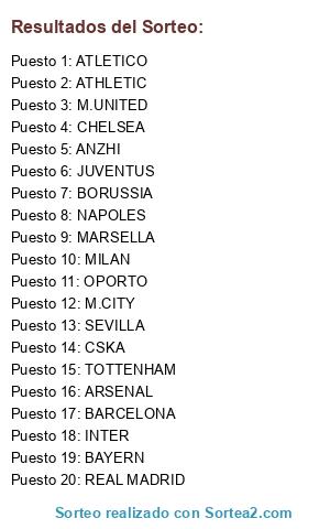 Lista de participantes: ATLETICO, ATHLETIC, M.UNITED, CHELSEA, ANZHI, JUVENTUS, BORUSSIA, NAPOLES, MARSELLA, MILAN, OPORTO, M.CITY, SEVILLA, CSKA, TOTTENHAM, ARSENAL, BARCELONA, INTER, BAYERN, REAL MADRID.