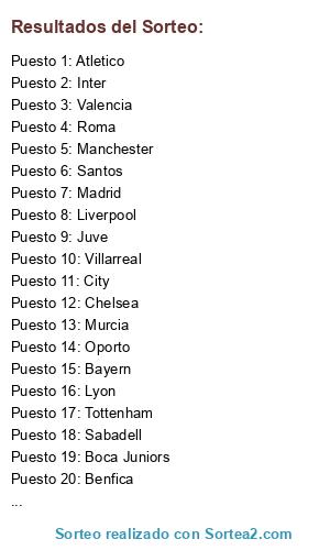 Lista de participantes: Murcia, Milan, Bayern, Juve, Inter, Madrid, City, Boca Juniors, Villarreal, Tottenham, Barça, Chelsea, Sabadell, Benfica, Oporto, PSG, Lyon, Valencia, Roma, Manchester, Atletico, Santos, Liverpool, Malaga.