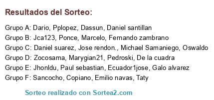 Lista de participantes: Pplopez, Batallas, Daniel suarez, Pedroski, Dario, Daniel santillan, Galo alvarez, Ecuador1jose, Jhonldu, Ponce, Emilio navas, Jose rendon., Dassun, Zocosama, Sancocho, Copiano, Marcelo, Marygian21, Jca123, De la cuadra, Michael Samaniego, Oswaldo, Fernando zambrano, Taty.