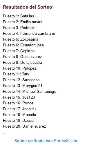 Lista de participantes: Pplopez, Batallas, Daniel suarez, Pedroski, Dario, Daniel santillan, Galo alvarez, Ecuador1jose, Jhonldu, Ponce, Emilio navas, Jose rendon., Dassun, Zocosama, Sancocho, Copiano, Marcelo, Marygian21, Jca123, De la cuadra, Michael Samaniego, Oswaldo, Fernando zambrano, Taty.