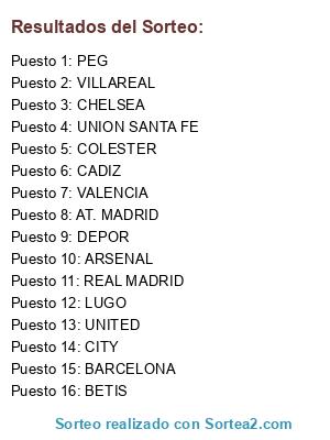 Lista de participantes: PEG, VALENCIA, AT. MADRID, UNITED, CITY, COLESTER, BETIS, UNION SANTA FE, ARSENAL, REAL MADRID, VILLAREAL, CHELSEA, LUGO, DEPOR, BARCELONA, CADIZ.