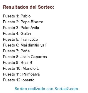 Lista de participantes: osento, Fran coco, Galán, Pepe Bixorro, Primoalva, Manolo L, Real B, Jokin Caparrós, Pako Ávila, Peña, Mai dimitió ya!!, Pablo.