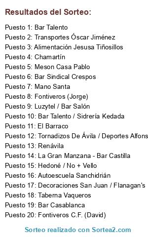 Lista de participantes: Transportes Óscar Jiménez, Autoescuela Sanchidrián, Fontiveros (Jorge), Alimentación Jesusa Tiñosillos, Renávila, Meson Casa Pablo, Chamartín, Mano Santa, La Gran Manzana - Bar Castilla, Fontiveros C.F. (David), Bar Casablanca, Tornadizos De Ávila / Deportes Alfonso / Bar El Patio, Bar Sindical Crespos, Bar Talento, Luzytel / Bar Salón, Decoraciones San Juan / Flanagan's, Bar Talento / Sidrería Kedada, Taberna Vaqueros, El Barraco, Hedoné / No + Vello.