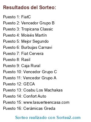 Lista de participantes: Vencedor Grupo A, Vencedor Grupo B, Vencedor Grupo C, Mejor Segundo, Cerámicas Greda, Confort Auto, Tropicana Classic, Fiat Cervera, Rasil, FiatC, Burbujas Carnavi, Moisés Martín, Caja Rural, Coabu Los Machakas, GECA, www.lasuerteencasa.com.