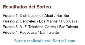 Lista de participantes: Distribuciones Abad / Bar Sur, Padecasa / Bar Talento, Centrelec / Los Maños / Pub Cava, A. F. Toledano Cortés / Bar Talento.