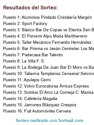 Lista de participantes: Cafetería Magalia, La Bodega De Juan Bar El Moro vs Bar Sur Distribuciones Abad, La Villa F. S., Jamones Blázquez Crespos, Taller Mecánico Fernando Hernández, Padecasa Bar Talento, Aluminios Pindado Cristalería Margón, Bar Prisma vs Jesán Centrelec Los Maños, El Porvenir Alpo Moda Martiherrero, Fiat Automóviles Cervera, Volvo Eurocatursa Árricas Express, Sotolux El Arco La Corneja C. Marisa, Azulejos Cerni, Taberna Templarios Censenal Servicios, Sport Factory, Básico Bar De Copas vs Electra San Bartolomé F. S..