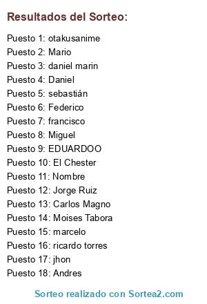 Lista de participantes: Nombre, francisco, daniel marin, Mario, Daniel, jhon, otakusanime, Federico, EDUARDOO, Jorge Ruiz, marcelo, Miguel, sebastián, ricardo torres, El Chester, Moises Tabora, Andres, Carlos Magno.